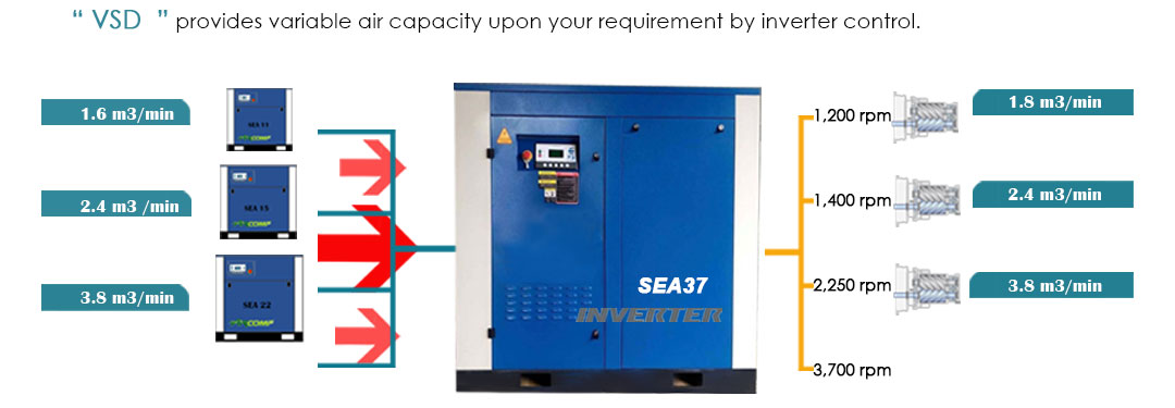 VSD achieves cost saving by ideal air capacity control. AIRCOMP inverter controlling system brings about larger capacity under lower pressure or higher pressure under smaller capacity. The operable pressure range is from 0.44 to 1.0MPa*, and air capacity is increasing maximum 6-14% compared with conventional models. (*In case of 50 HP /37kW model)