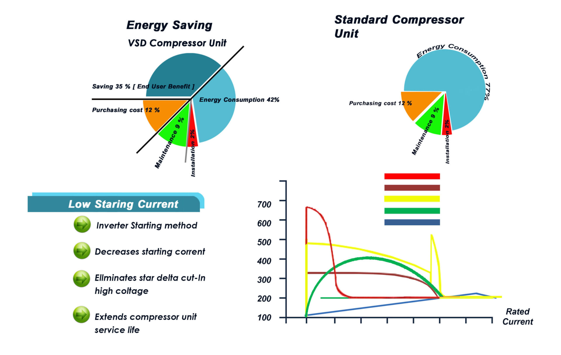 – Using Energy Design – an independent after-cooler set cooling inlet air , firstly can remove the moisture content 30% to 50%, dramatically reducing the cooling load on the system could save up to 20 – 30 %