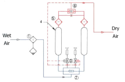 Heatless air dryer is composed of two alternate tower,one set of switching valves and one set of controlling system, In the swiching time, one tower is adsorbing while the other one is regenerating Efficiency, Dew point -70 -C.